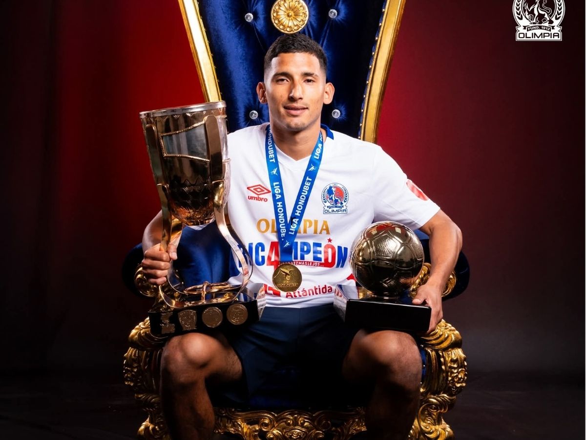En la imagen, el mediocampista aparece portando el trofeo de campeón y el balón dorado como símbolo de su gran temporada, mientras el escudo de Banfield refuerza los rumores de su inminente llegada al fútbol argentino, donde buscará consolidarse como legionario hondureño.